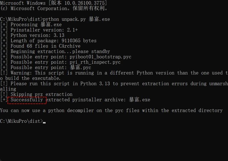暴富.exe跟unpack.py放在同一个目录中,cmd执行如下命令:等待出现successfully