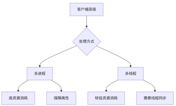 在多进程模型中,每当有新客户端连接时,服务器会fork出一个子进程专门处理该连接。这种"一个客户端一个进程"的方式简单直观,就像为每位顾客配备专属服务员。