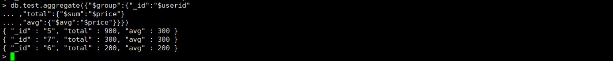 db.test.aggregate({"$group":{"_id":"$userid","avg":{"$avg":"$price"},"max":{"$max":"$price"},"min":{"$min":"$price"}}})