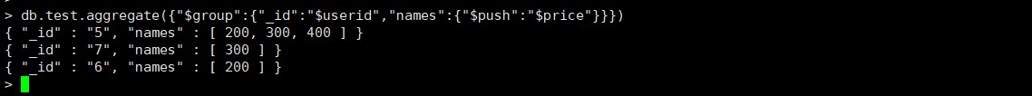 db.test.aggregate({"$group":{"_id":"$userid","names":{"$push":"$price"}}})