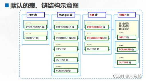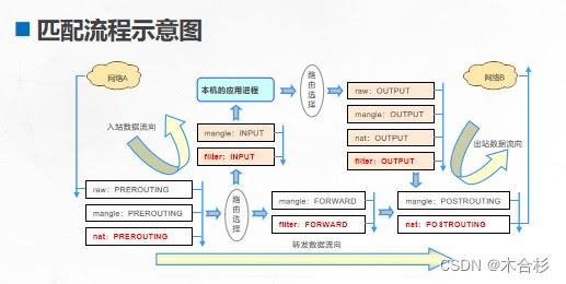 这四个表共同构成了 iptables 防火墙的核心,允许管理员通过配置规则和链来控制数据包的流向、处理和修改。这种细粒度的控制有助于实施网络安全策略和网络地址转换等功能。管理员可以使用不同链和规则来自定义防火墙行为,以满足网络环境的需求。