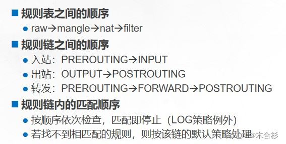 自上向下按顺序依次进行检查,找到相匹配的规则即停止(log策略例外,表示记录相关日志) 若在该链内找不到相匹配的规则,则按该链的默认策略处理(未修改的状况下,默认策略为允许)