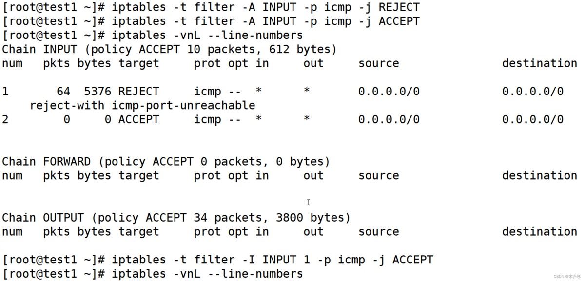 内容匹配删除(有两个相同的则作用为去重) 如果有两个重复的规则,则删除序号较小的 [root@localhost ~]# iptables -d input -p icmp -j reject #删除序号小的 演示删除序号较小的 [root@localhost ~]# iptables -t filter -a input -p icmp -j reject [root@localhost ~]# iptables -t filter -a input -p icmp -j accept [root@localhost ~]# iptables -t filter -a input -p icmp -j reject [root@localhost ~]# iptables -nl input --line-number chain input (policy accept) num target prot opt source destination 1 reject icmp -- 0.0.0.0/0 0.0.0.0/0 reject-with icmp-port-unreachable 2 accept icmp -- 0.0.0.0/0 0.0.0.0/0 [root@localhost ~]# iptables -d input -p icmp -j reject #第二次就时删除指定。 [root@localhost ~]# iptables -nl input --line-numbers chain input (policy accept) num target prot opt source destination 1 accept icmp -- 0.0.0.0/0 0.0.0.0/0 注意:按照内容匹配删除规则,只能每次删除内容相同序号较小的规则。 直到删除最后一条时,才能将该规则全部清除 。 一定要报保证该匹配的内容存在,且完全匹配规则才能删除,不然报错。