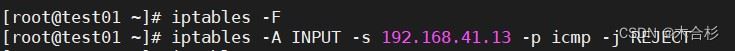 [root@localhost ~]# iptables -i input 1 -i ens33 -s 192.168.41.0/24 -j drop #禁止指定的网络设备名称ens33的所有网段