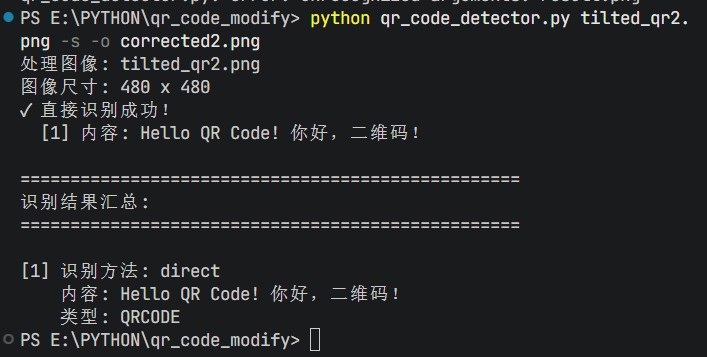 程序提供两种检测方法:基于opencv的qrcodedetector和基于轮廓分析的备用方法。通过透 视变换纠正倾斜二维码,并提供多种图像增强方法提高识别率。支持直接识别、纠正后识别和增强后识别三种处理方式,可输出识别结果和保存纠正后的图像。