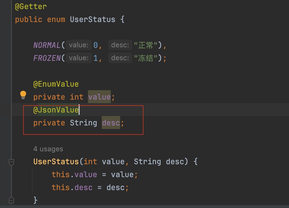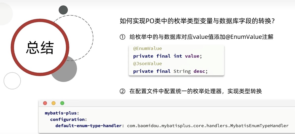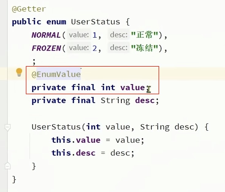 1、通过注解@enumvalue,告诉mp,枚举中的哪一个字段作为数据库中的存值