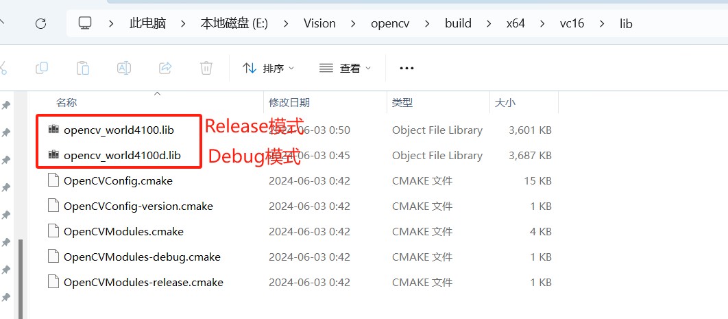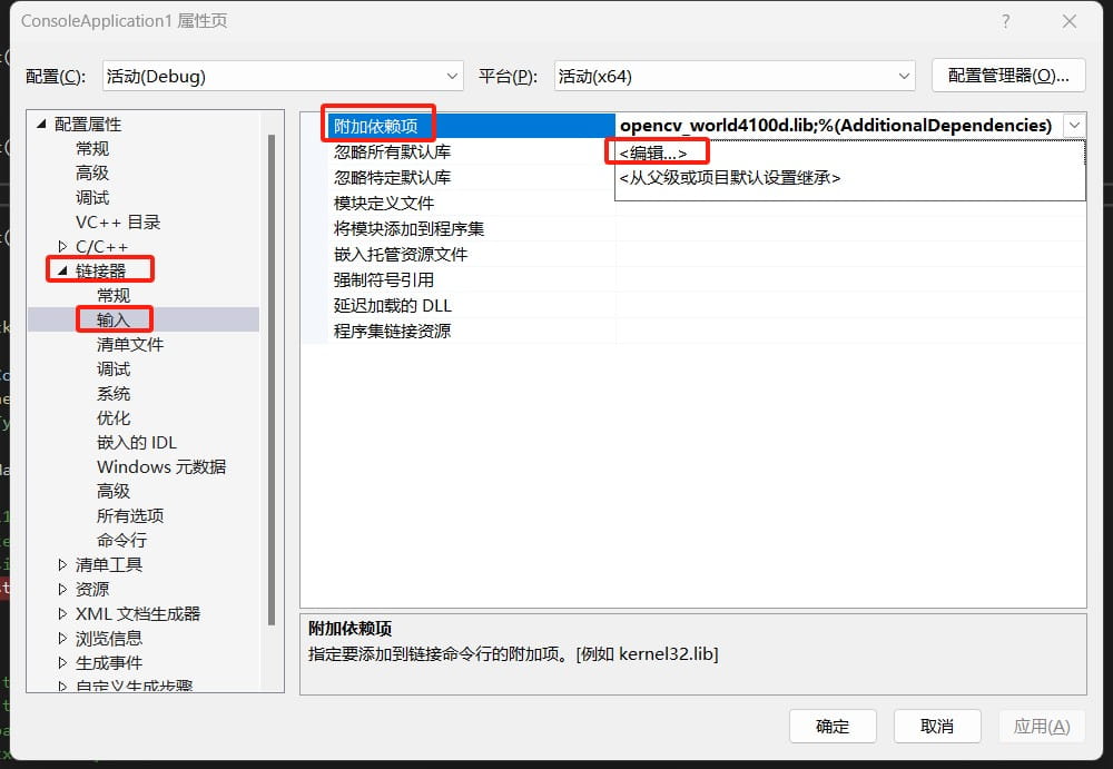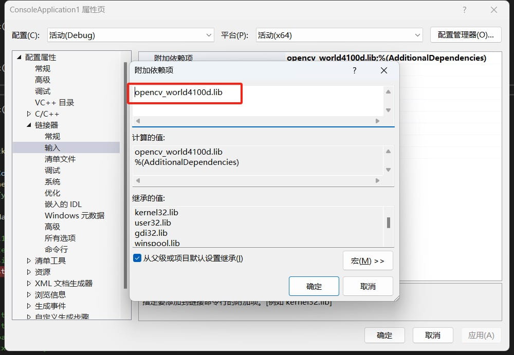 此示例用的debug调试模式,添加opencv_world4100d.lib