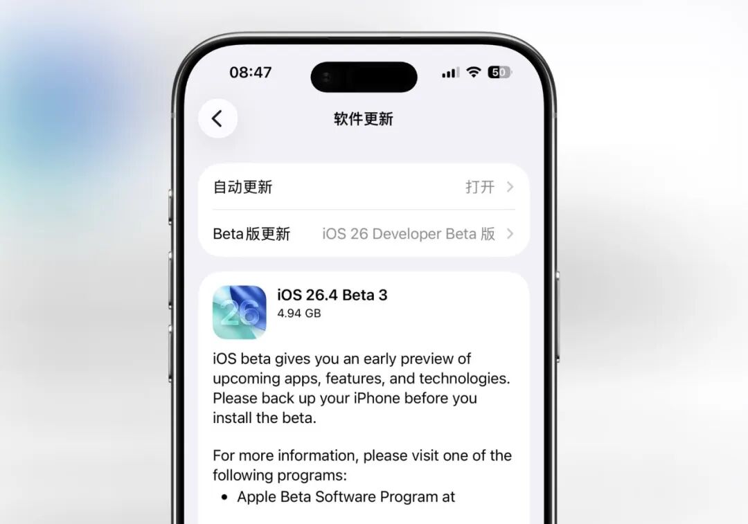 总之,ios 26.4 beta 3 主要还是一个以优化为主的小更新,尤其是修复了 app store 加载缓慢的问题,如果你已经更新了 ios 26.4 beta 的话,非常建议更新到这个版本。