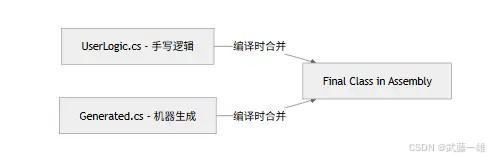 partial只是编译器层面的语法糖。运行时的 clr(公共语言运行时)根本不知道分部类的存在,它看到的永远是一个完整的类。 - source generators (源代码生成器): .net 5+ 引入的新技术,在代码编译期间实时生成额外的 c# 代码。它极度依赖分部类,因为它不能修改你现有的代码,只能通过