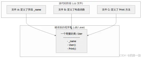 partial关键字的类。如果发现命名空间相同、类名相同的partial类,它会把它们所有的成员(字段、属性、方法、构造函数)全部收集起来,塞进同一个 il(中间语言)定义里。 - 符号的唯一性:由于它们最终是一个类,所以普通的 c# 规则依然适用。比如,你在 a 文件里定义了