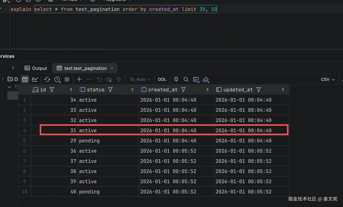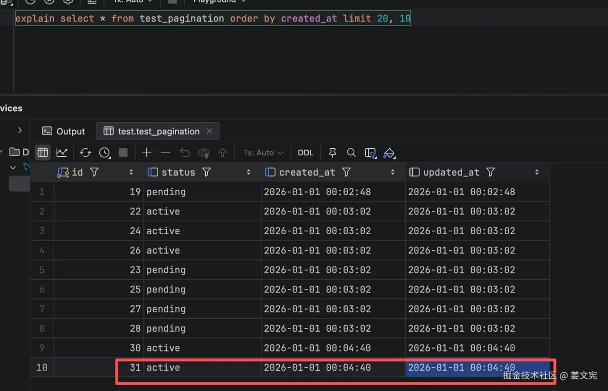 -- 优化前 select * from test_pagination order by created_at limit 20, 10; -- 优化后 select * from test_pagination order by created_at, id limit 20, 10;