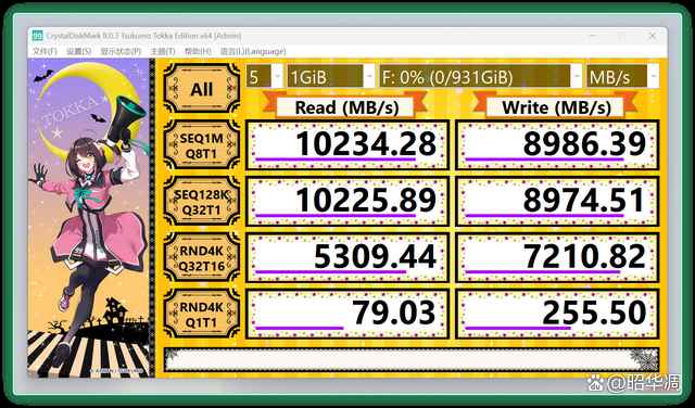 本次测试中,铠侠 vc10 的顺序读取速度 10234 mb/s,顺序写入也达到了 8986 mb/s,和官方标称数据基本 一 致。
