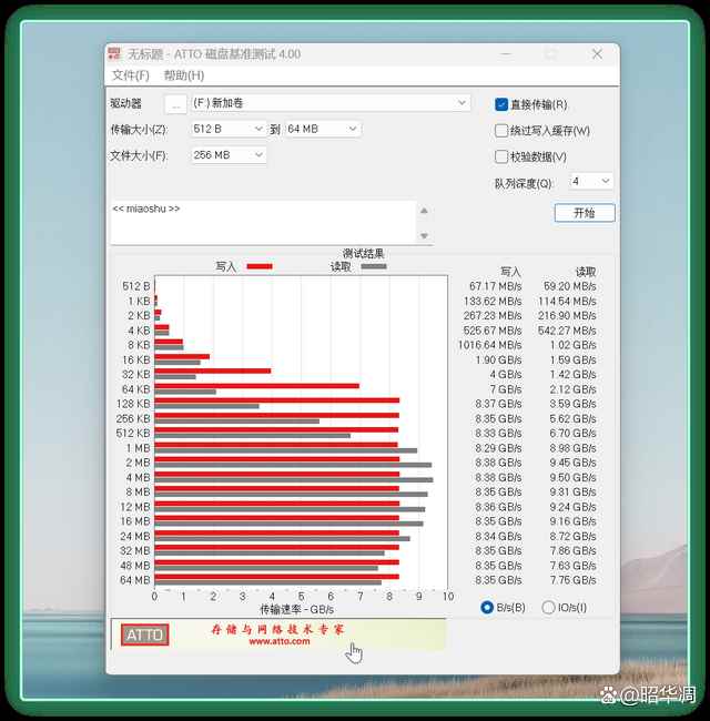 ▼而在 atto 基准测试中,8kb 的文件就能超过 1gb/s 的写入速度,4mb 文件达到了读写双满速的状态。
