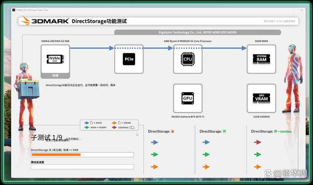 3dmark 的 directstorage 就是专门针对该功能的测试,其中包含了 九 个子测试项目,全面覆盖了 directstorage 关闭、开启、以及开启并启用 gpu 解压缩等多种模式,并在各种模式下分别测试数据从 ssd 到内存、从内存到显存、以及从 ssd 直达显存等不同路径的传输速率。