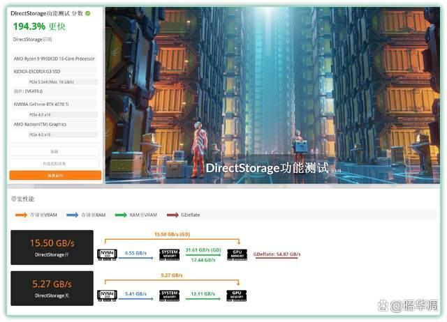▼ 从实测结果来看:在没有开启 directstorage 功能时,数据搬运到显卡的带宽仅有5.37 gb/s,虽然也不慢,但远没发挥出 pcie 5.0 的潜力。