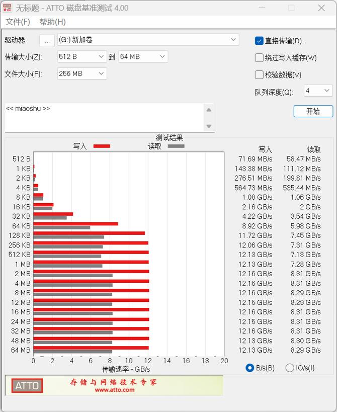 atto diskmark的测试中,这是一款测试顺序读写的基准性能测试软件,在这个测试项目中,我们可以看到,铠侠ve10的顺序读取成绩为12.13gb/s,顺序写入成绩为8.29gb/s。