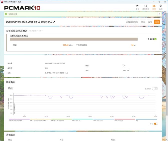 pcmark10的完整系统盘基准测试项目中,铠侠ve10的综合分数为4774,带宽为739.22mb/s,延时同样仅为34us,这样的性能表现,在同类型的产品中,性能释放表现优秀。