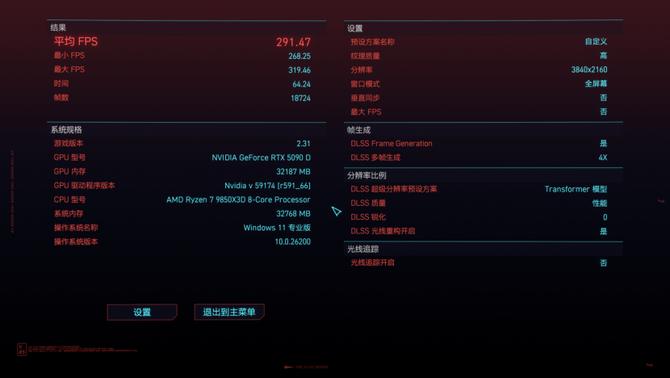 4k的3a游戏大作《赛博朋克2077》的话,在4k的游戏分辨率下,游戏的帧数来到了291fps,在测试的整个过程中画面非常精致,游戏过程流畅顺滑,没有任何卡顿的迹象,能够保证高端专业的游戏玩家,获得极为出色的游戏体验。