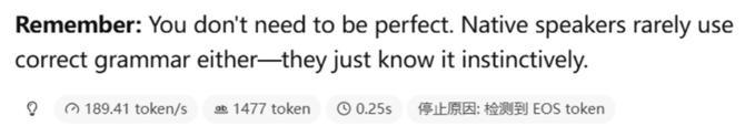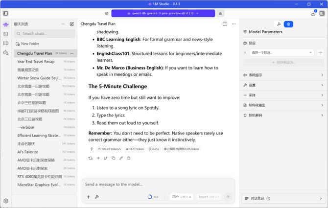 我们使用lm studio进行本地的ai大模型测试,在测试过程中,首词的响应时间为0.25s,生成1477 token的平均速度为189.41 token/s,能够轻松满足内容创作者的要求。