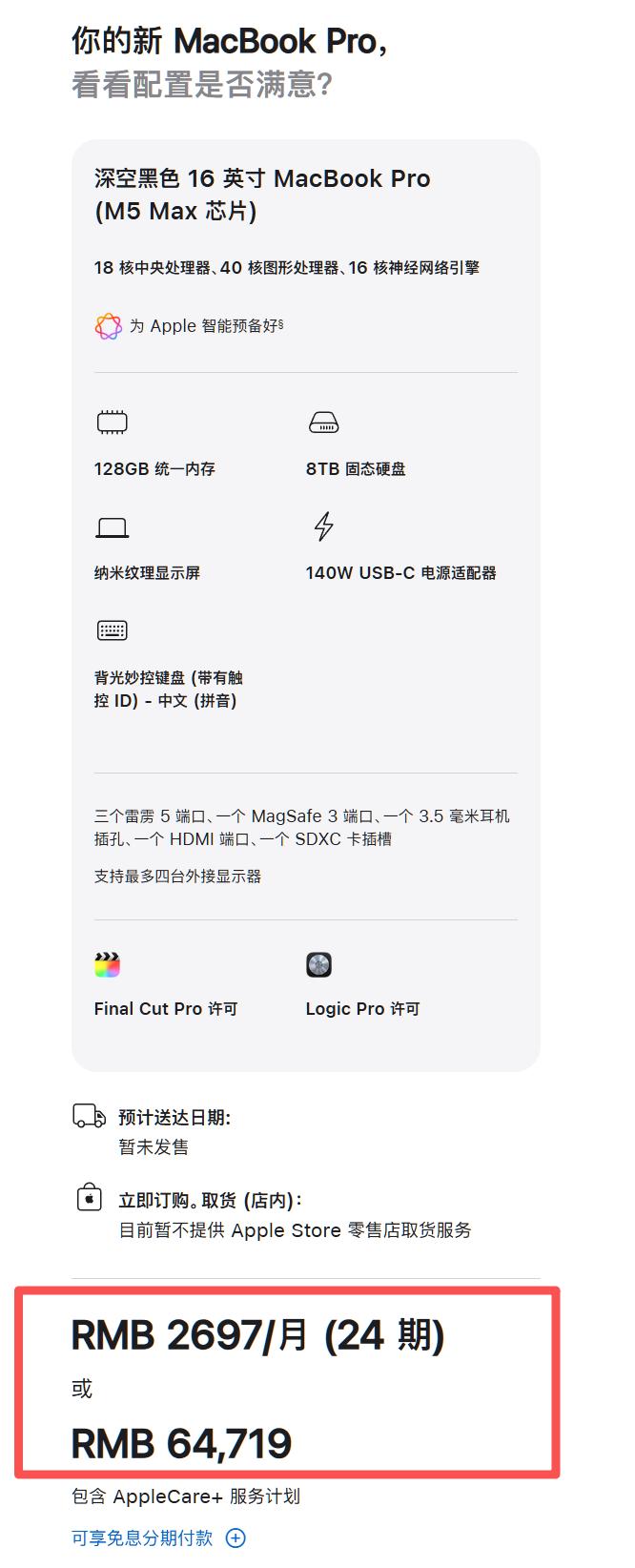 价格方面,14英寸搭载新m5 pro的macbook pro起售价为17999元,存储为24gb+1tb起步,如果是16英寸m5 max版全部“拉满”,总价最高在64719元,当然,这包含了两款软件和apple care服务,去除后大约58124元。