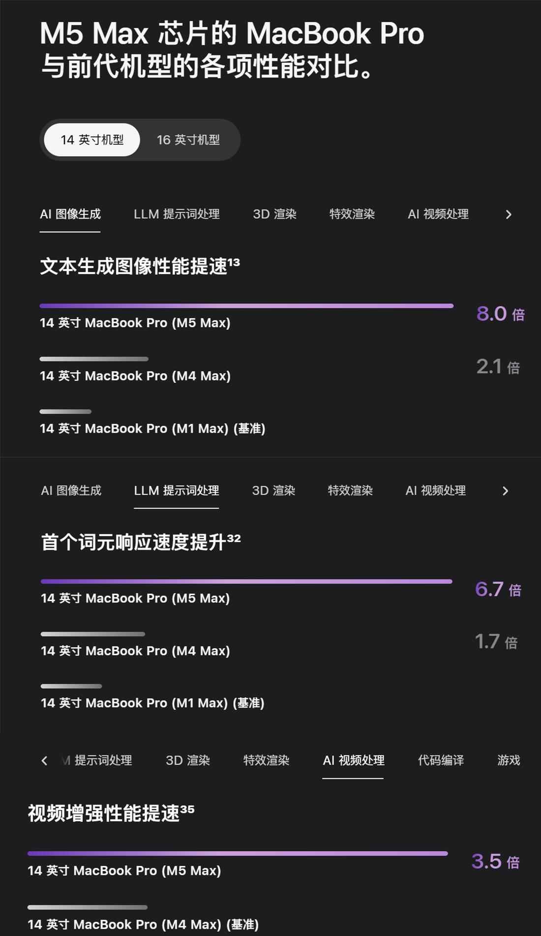 两颗芯片的每个gpu内核都塞入了神经网络处理器,加上统一内存性能的提升,m5 max的ai峰值性能相比上代暴涨了4倍。