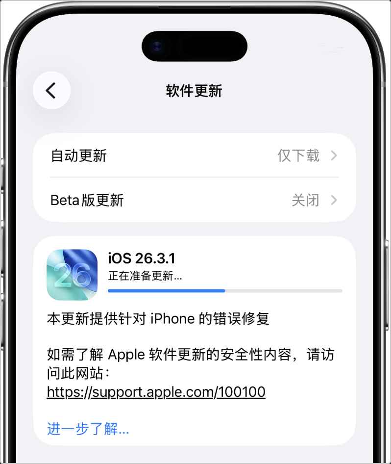 ios26.3.1 正式版的版本号是23d8133,更新日志显示,该版本主要是针对iphone的错误修复,包括: