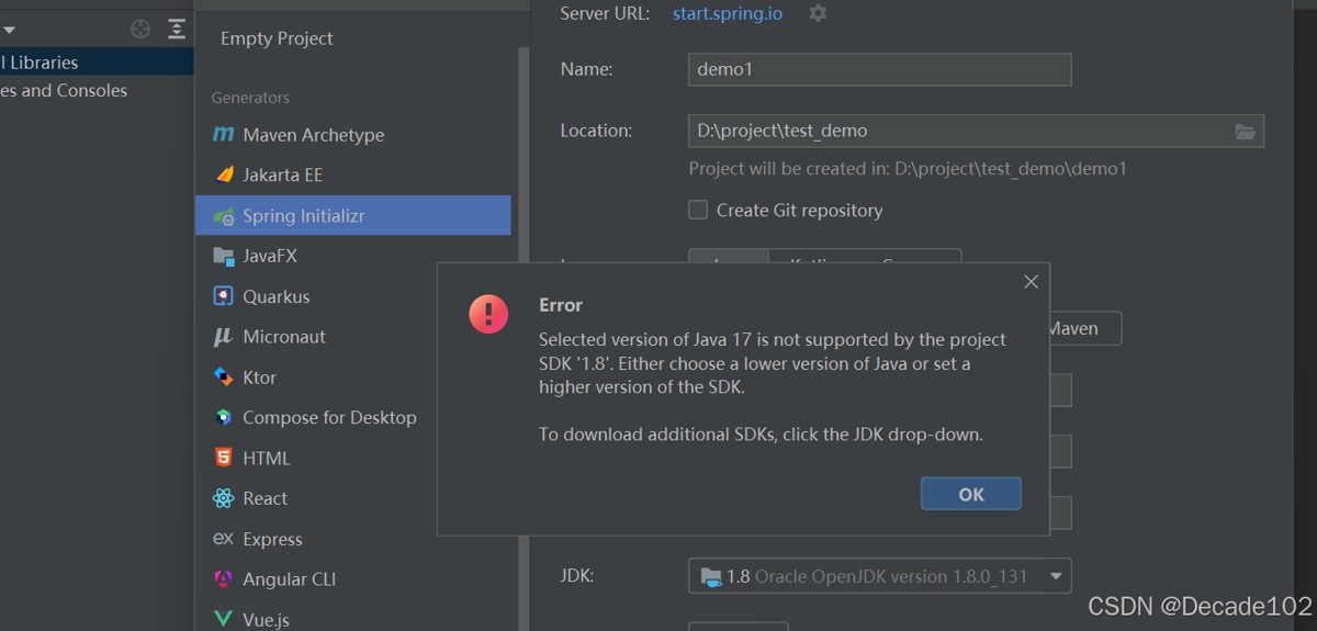 selected version of java 17 is not supported by the project sdk ‘1.8’. either choose a lower version of java or set a higher version of the sdk. to download additional sdks, click the jdk drop-down.