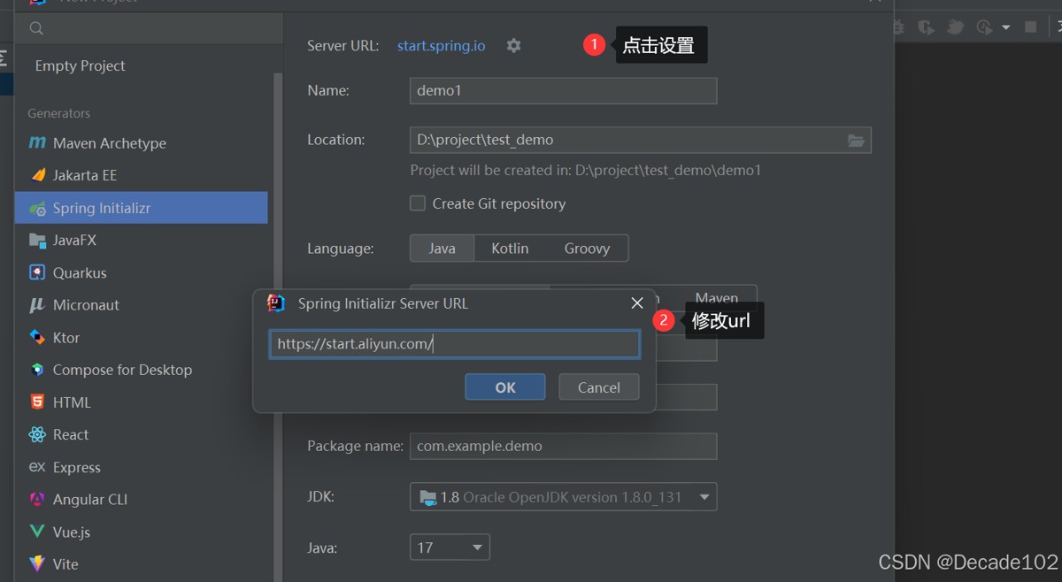 替换spring boot项目初始化源地址,创建springboot项目时,点击server url右侧的⚙,将https://start.spring.io/ 或者 http://start.springboot.io/ 替换为 https://start.aliyun.com/ 即可