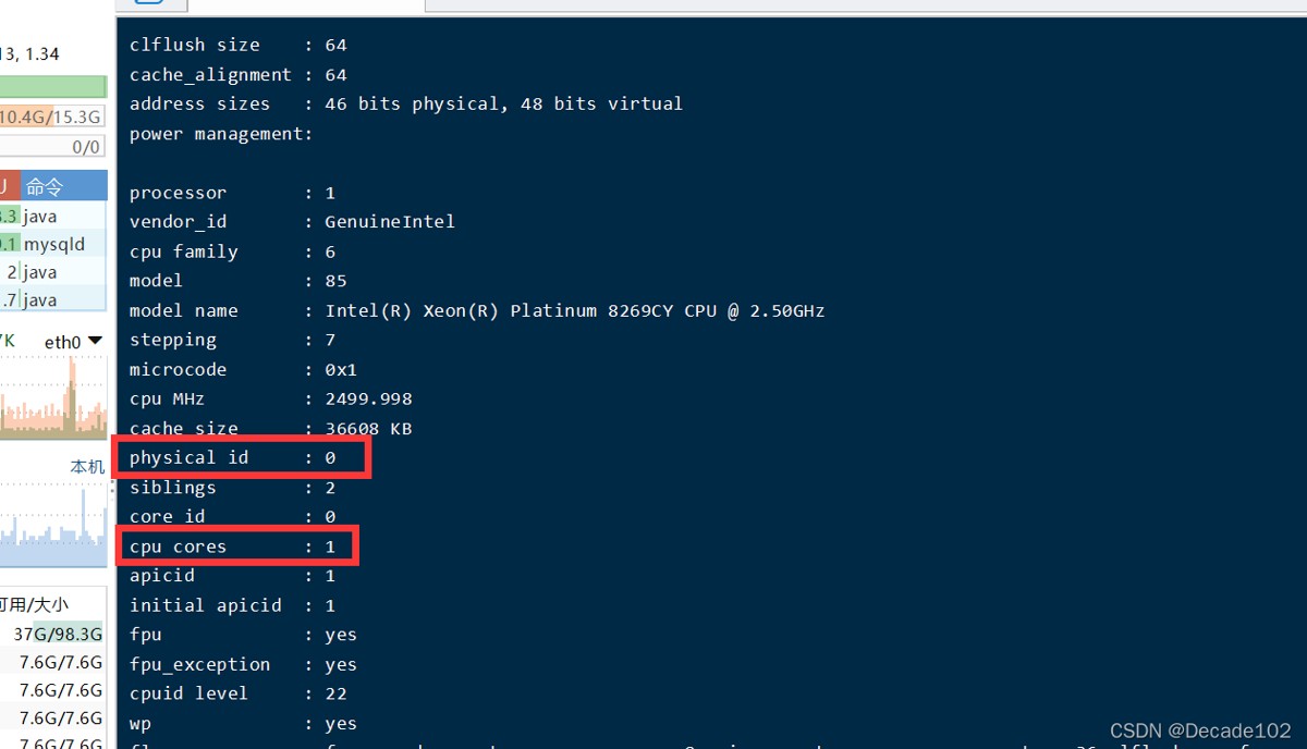 cpu的信息存放在/proc/cpuinfo中,如下图所示,physical id代表第几个cpu,编号从0开始,cpu cores 代表核数,可以看出是1颗1核的cpu,即cpu个数是1个。