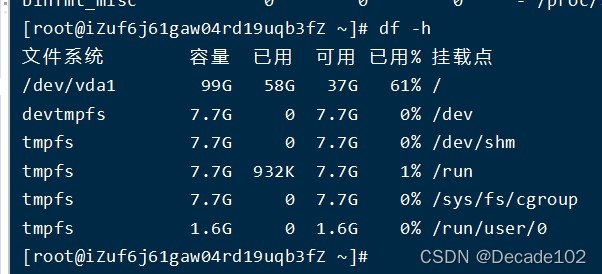 df -h :以人类可读的格式显示磁盘空间(否则默认显示单位是字节,不直观) df -a :包含全部的文件系统