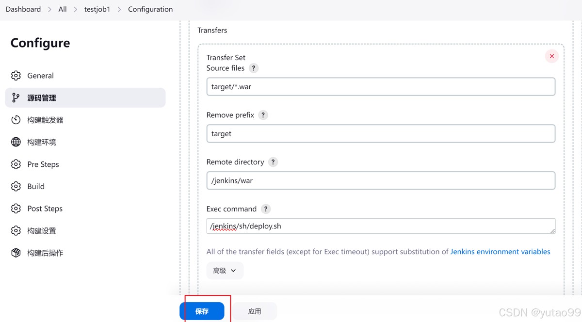 tomcat(192.168.229.21)在接收到源码之后的自定义动作。 比如:将源码拷贝到网站的主目录(/jenkins),并执行一些其他操作如重启服务器等(或创建文件touch)(需要后台创建) # mkdir /jenkins/sh # cat /jenkins/sh/deploy.sh cp -r /jenkins/war/*.war /jenkins touch /tmp/aaaaaa.txt #chmod +x /jenkins/sh/deploy.sh