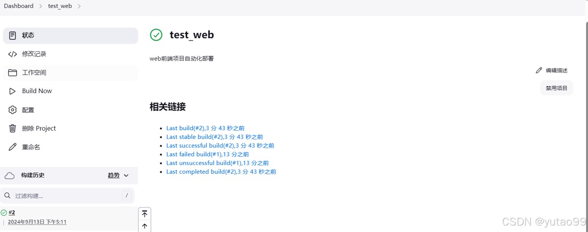 [root@yt ~]# mkdir /root/web [root@yt ~]# vim web.sh # jenkins 拉取代码存放地址 cd /root/web # 为什么要切换目录:因为npm install执行安装依赖要在项目目录下才能找到需要的依赖是什么才可以执行。 npm install npm run build # 将vue项目进行打包成浏览器可以识别的html、css、js文件 rm -rf /usr/share/nginx/html/* cp -r /root/web/dist/* /usr/share/nginx/html/ systemctl restart nginx.service [root@yt ~]# chmod +x /root/web.sh