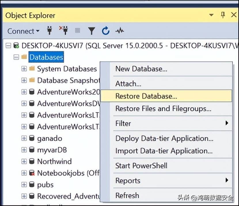 2.选择"数据库"文件夹,右键单击它,然后选择"还原数据库"选项。