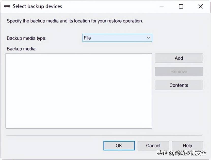 4.在"选择备份设备"窗口中,选择"文件"作为备份介质,然后按"添加"按钮。