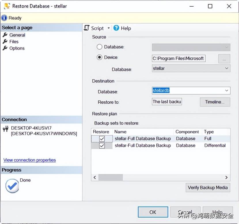 3.接下来将显示"还原数据库"窗口。在"常规"页面的"源"部分下,选择以下任一选项: