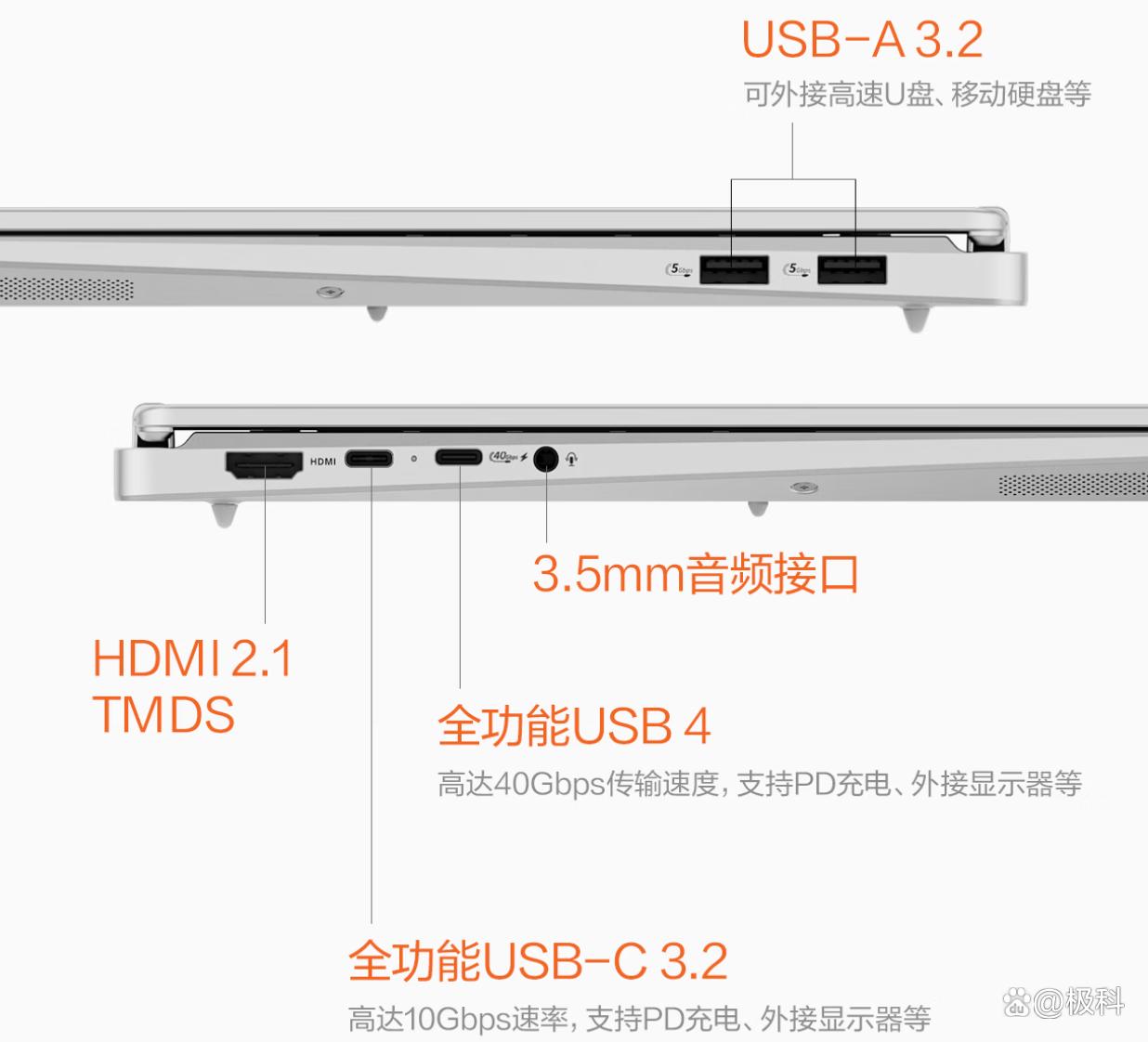 接口与扩展性:属于够用但不够豪华水准。接口布局为,左侧usb-c 10gbps、usb4(支持100w pd充电和dp2.1)、hdmi 2.0、3.5mm音频;右侧两个usb-a 5gbps。