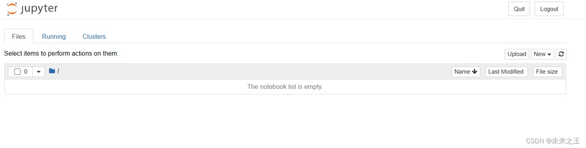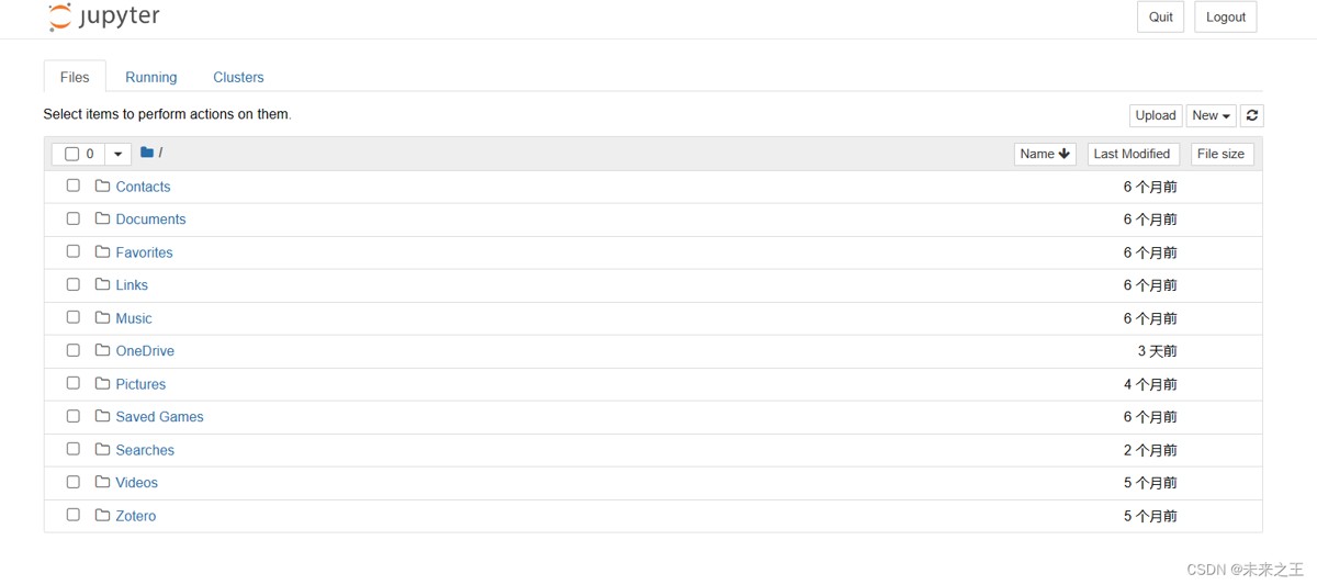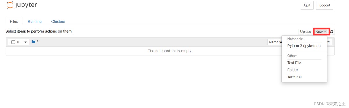 启动jupyter notebook成功之后是这样的,files页面是用于管理和创建文件相关的类目,可以在右侧的new下拉菜单中选择创建python文件