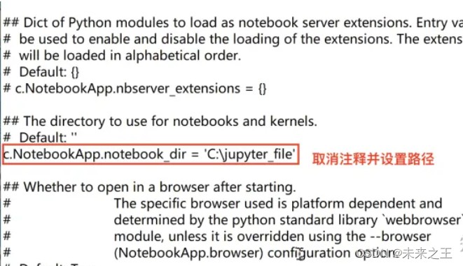 找到内容之后,取消注释改成指定的目录,按小写i进入编辑模式,底部出现“--insert--”说明成功进入编辑模式。在c.notebookapp.notebook_dir=' 添加步骤1复制的路径 '。