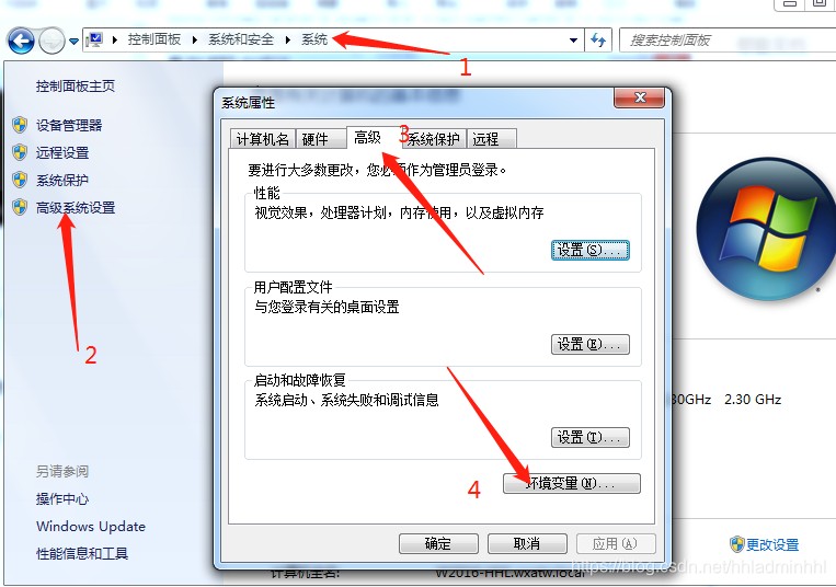 1.右击“控制面板\系统和安全\系统”→“高级系统设置” →“高级“→“环境变量”;