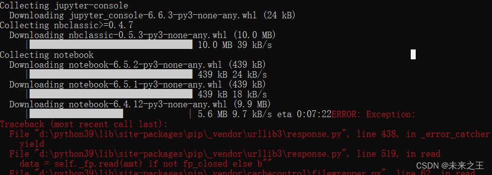 二、在用pip命令:pip install jupyter notebook 下载时会出现某个下载包无法继续下载的情况。