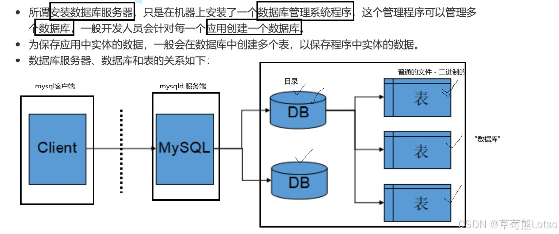 - 数据库服务器:安装在机器上的数据库管理系统(如 mysql),负责管理多个数据库;