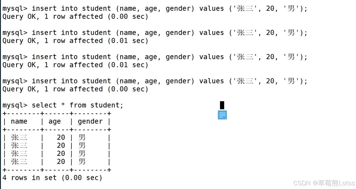 insert into student (id, name, gender) values (1, '张三', '男'); insert into student (id, name, gender) values (2, '李四', '女'); insert into student (id, name, gender) values (3, '王五', '男');