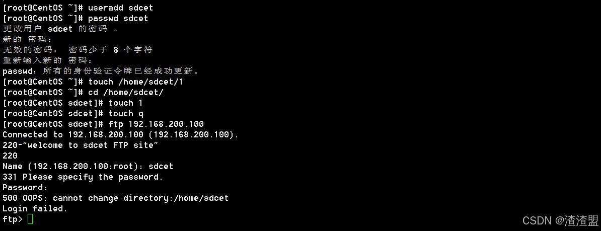 connected to 192.168.0.100 (192.168.0.100). 220-welcome to sdcet ftp site //显示欢迎信息 220 name (192.168.0.100:root): sdcet //输入用户名 331 please specify the password. password: //输入密码 230 login successful. //登录成功