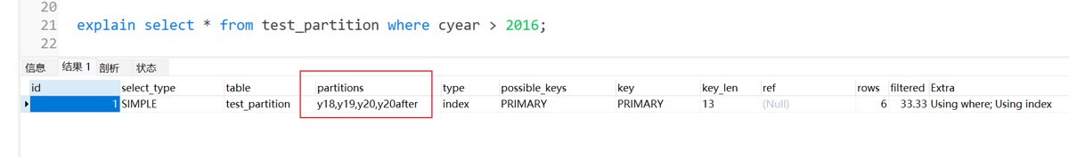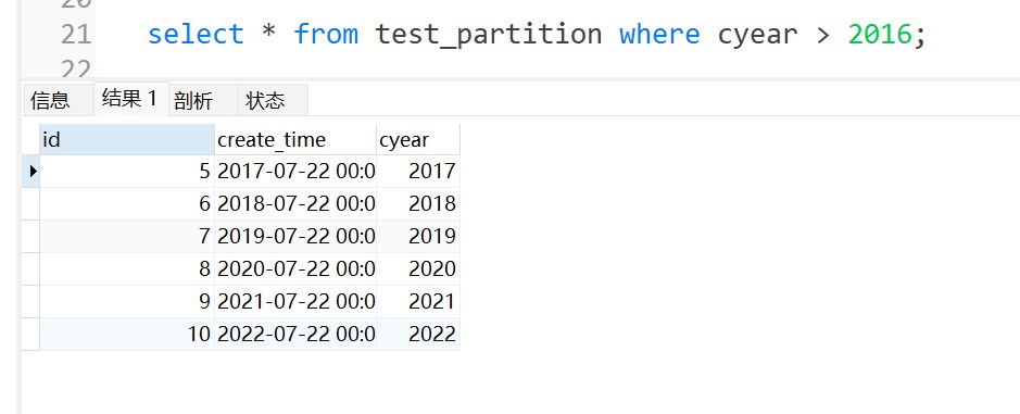 create table test_partition ( id int(11) not null, create_time datetime not null, cyear int, primary key (id,create_time , cyear) ) engine=innodb default charset=utf8; insert into test_partition values (1,"20130722000000",2013); insert into test_partition values (2,"20140722000000",2014); insert into test_partition values (3,"20150722000000",2015); insert into test_partition values (4,"20160722000000",2016); insert into test_partition values (5,"20170722000000",2017); insert into test_partition values (6,"20180722000000",2018); insert into test_partition values (7,"20190722000000",2019); insert into test_partition values (8,"20200722000000",2020); insert into test_partition values (9,"20210722000000",2021); insert into test_partition values (10,"20220722000000",2022);