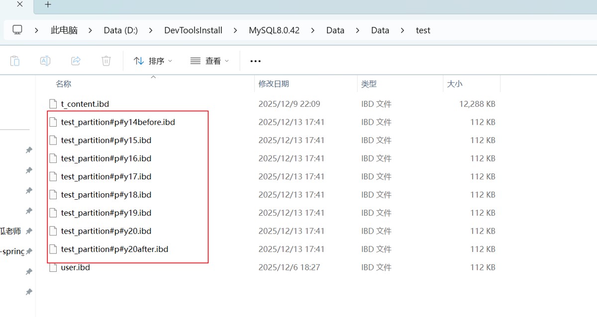 可以看到在数据库安装目录的data目录中,test这个文件夹下面有这样一些文件,这就是test数据库中test_partition表的不同分区数据。文件名称对应的就是表名称+分区的名称。