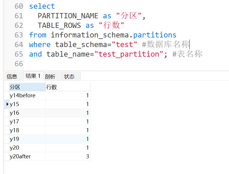 select partition_name as "分区", table_rows as "行数" from information_schema.partitions where table_schema="test" #数据库名称 and table_name="test_partition"; #表名