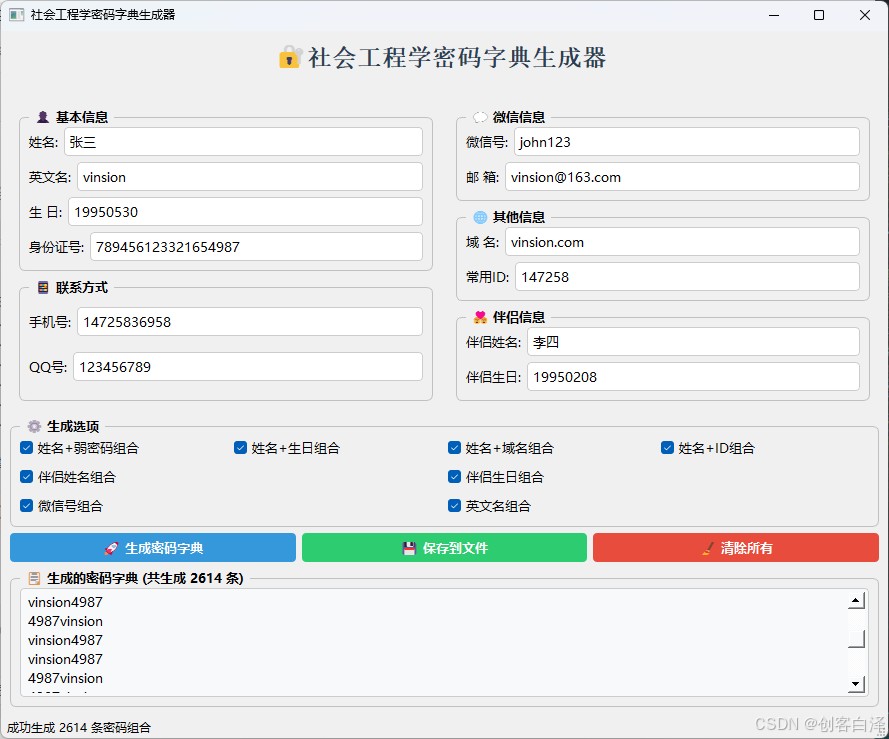 在网络安全领域,密码破解是渗透测试的重要环节。据统计,85%的成功入侵都源于弱密码或基于个人信息设置的密码。本文将详细介绍一款基于pyqt5开发的社会工程学密码字典生成器,它能够根据目标个人信息智能生成高命中率的密码组合。