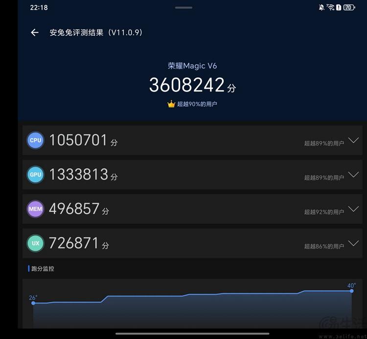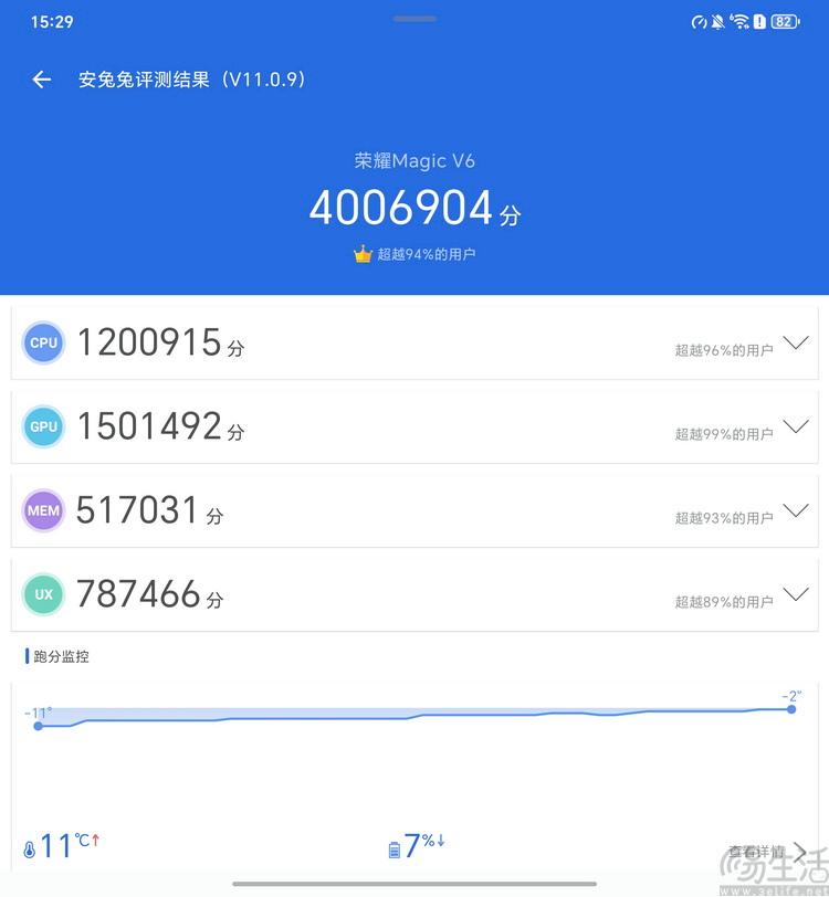 在安兔兔评测v11中,我们手头这台16gb+512gb的magic v6,常温下得综合成绩约为360万分,低温环境则可以达到400万分以上。