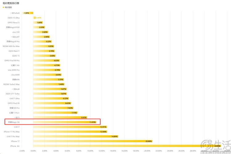 荣耀magic v6在相对差距排行榜中的排名
