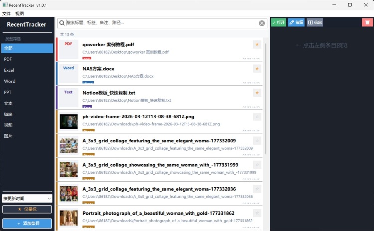 痛点:文件分散在多个目录,缺少统一入口;不同格式(pdf、word、图片)需要打开不同程序才能看内容;打开次数、标签、备注等元数据无处记录。